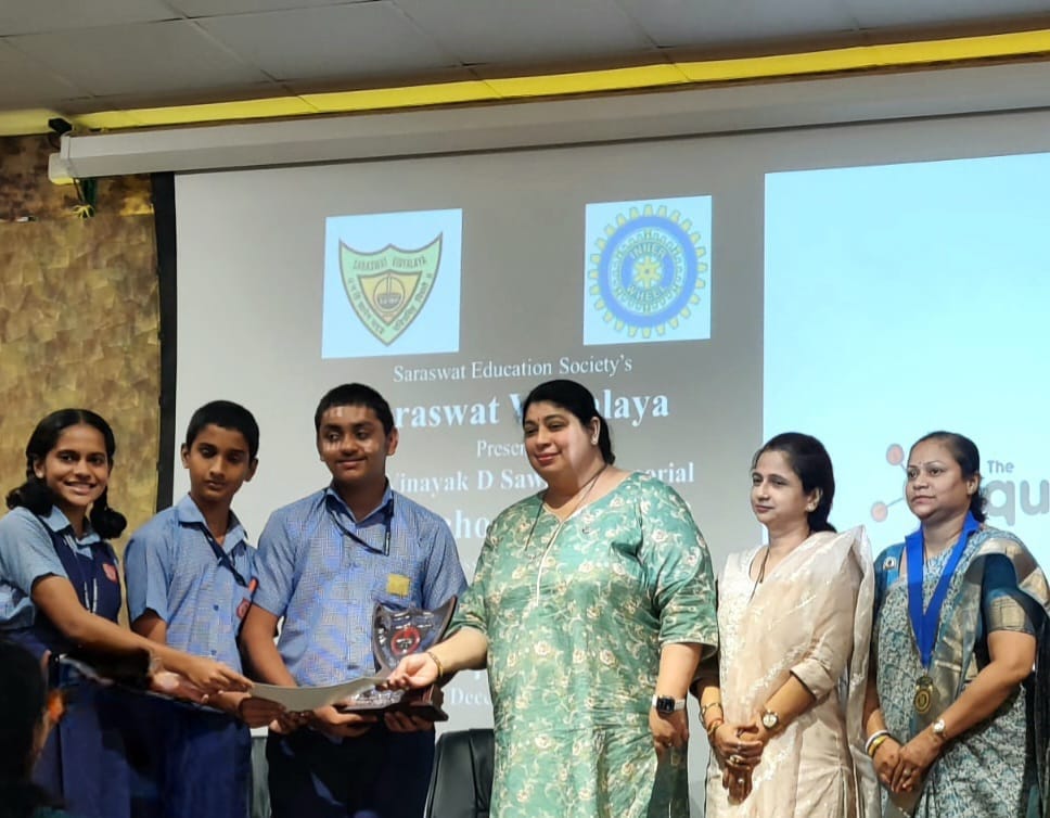 Miss Aaditi Mayekar(9A),Mast. Deepkrishna Kamat (9A) and Mast. Shriganesh Savant (9B) won the second place in the late. Vinayak D. Sawkar memorial Quiz Competition held at Saraswat Vidyalaya in association with the Inner Wheel club of Mapusa Elite on 9th December,2023.